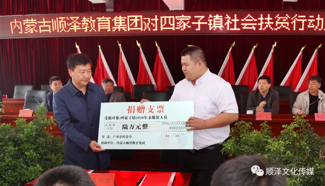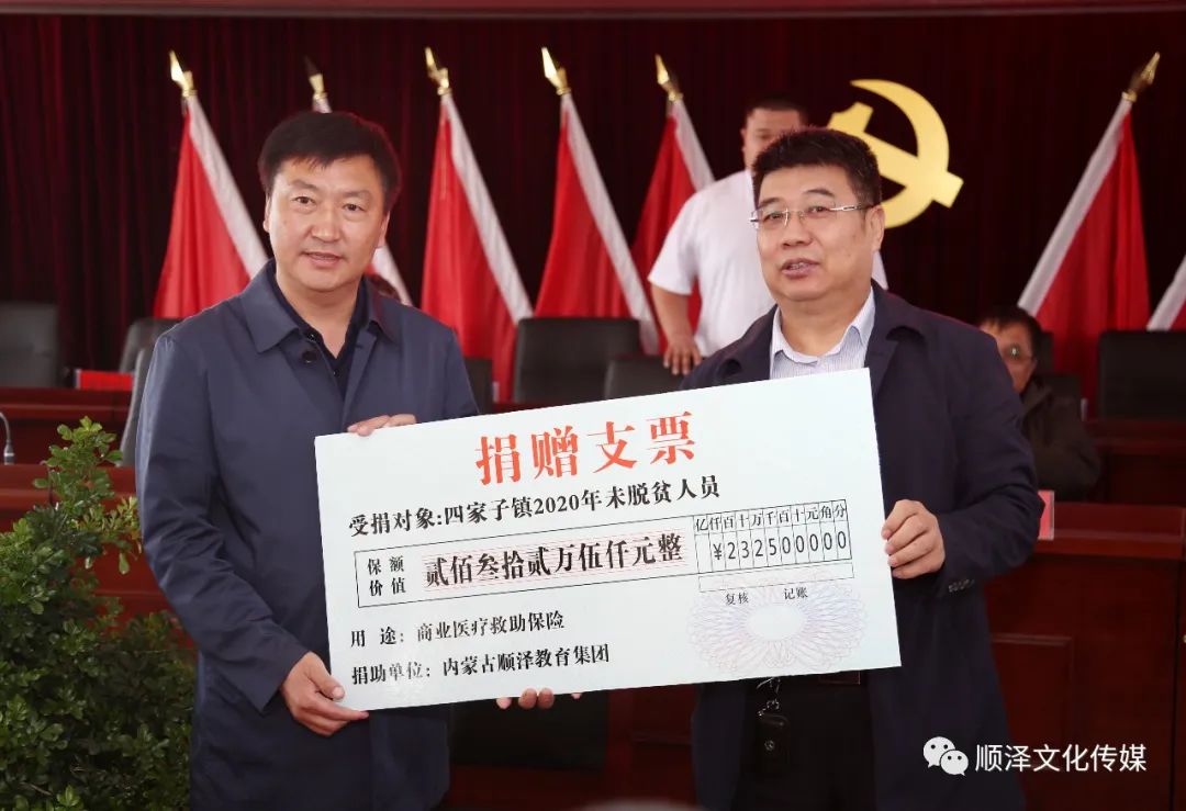 2018年10月顺泽教育举行“精准扶贫”捐资助学活动,向哈拉道口镇20名贫困学生捐助20000元人民币助学金。