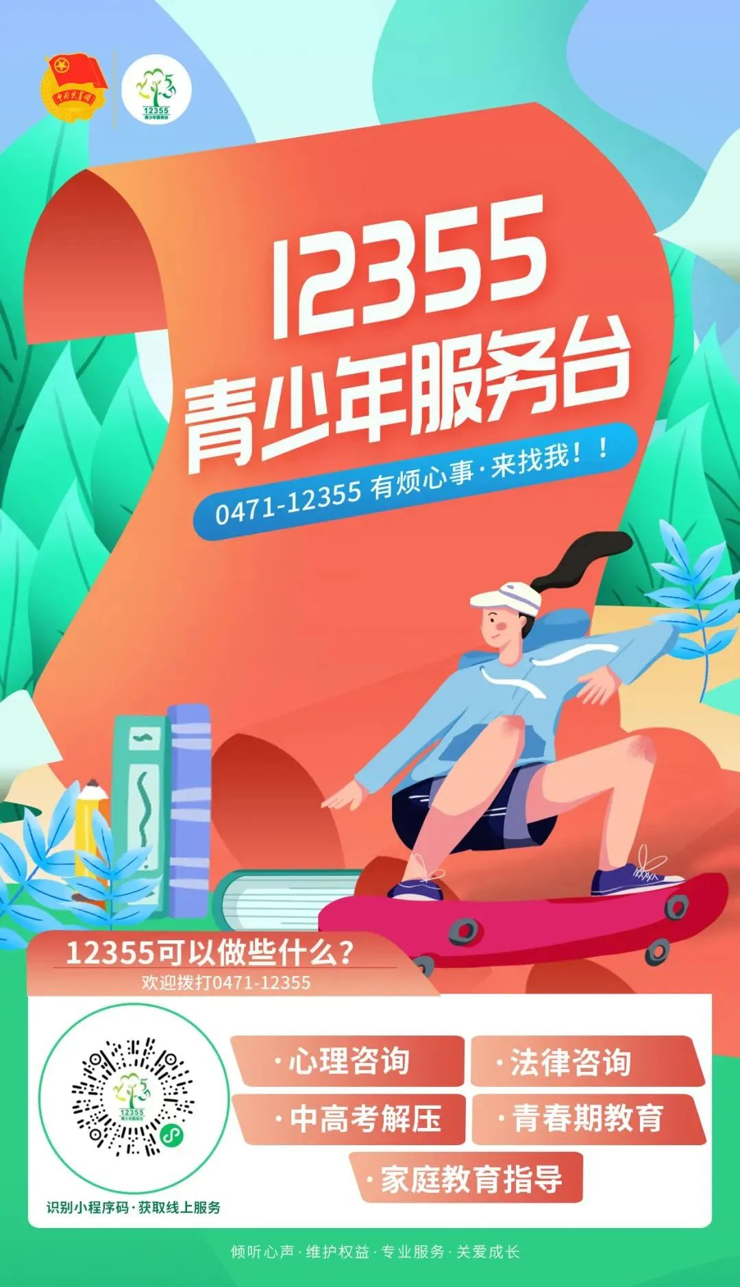 如果您有不适的情绪和想要倾诉的想法,可以通过微信小程序搜索“内蒙古12355青少年服务台”或者拨打内蒙古团委12355青少年服务热线0471-12355寻求帮助,我们将7x24小时竭诚为您服务!