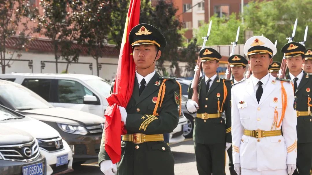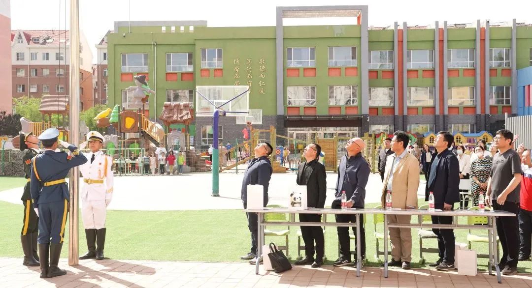 伴随着嘹亮的《义勇军进行曲》,全体师生和来宾起立行注目礼,鲜艳的五星红旗冉冉升起。