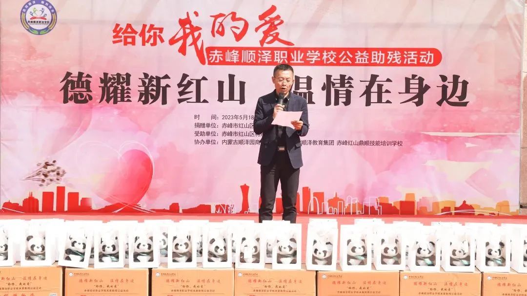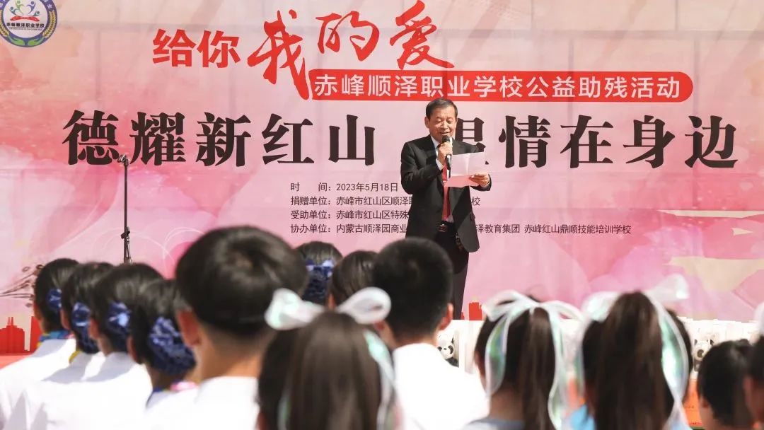 一场主题为“给你,我的爱,德耀新红山,温情在身边”赤峰顺泽职业学校公益助残活动启动仪式在红山区特殊教育学校举行,红山区教育系统党委副书记林柏波、红山区教育局副局长王雪东、红山区教育局职业教育股股长张基铸、红山区融媒体中心副主任聂文宇、红山区残联副理事长杜鑫宇、红山区残联组织宣传部主任蔡久兴、红山区残联教育就业部主任吴丽琴、红山区残联就业服务中心主任孙瑛卉、赤峰顺泽职业学校党支部书记胡耀文、赤峰顺泽职业学校副校长傅宝江、赤峰顺泽职业学校工会主席郑树钧、红山区特殊教育学校党支部书记王志锐、红山区特殊教育学校校长王文斌等领导和媒体记者参加了启动仪式。