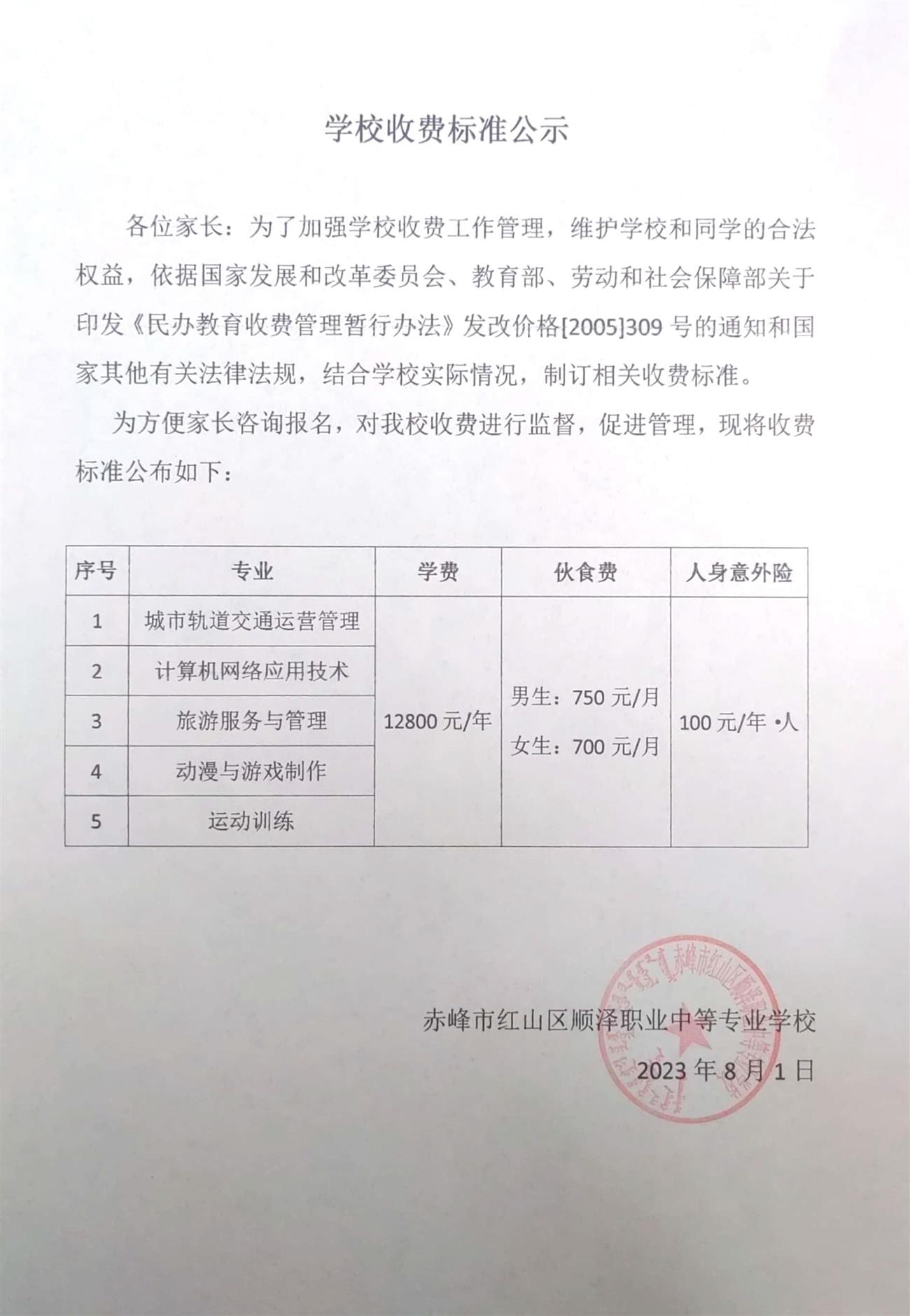顺泽职业学校收费标准公示
