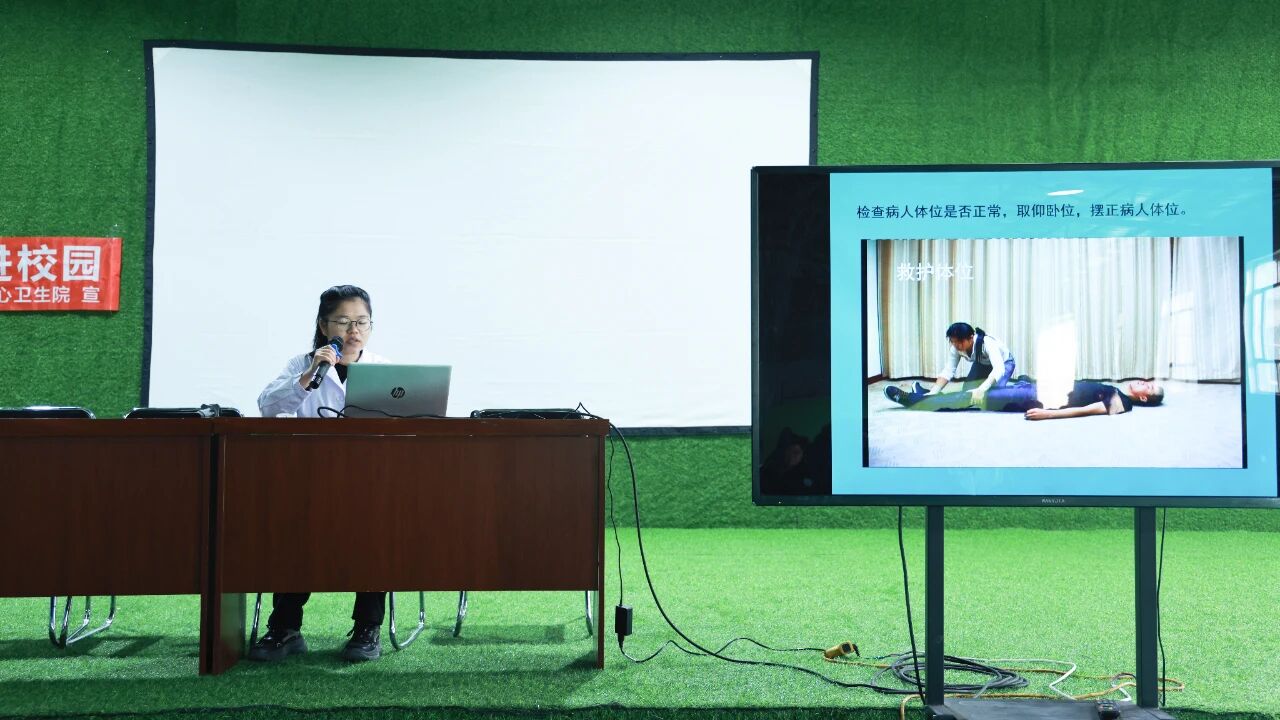 在互动环节中,医护人员利用人体模型,现场演示了心肺复苏的标准操作流程,并邀请学生上台进行实操演练。同学们踊跃参与,在医生的专业指导下初步掌握了关键的急救技能。此外,医生还就如何科学用眼、预防近视给出了具体建议,提醒同学们要远离电子产品,多参与户外活动。
