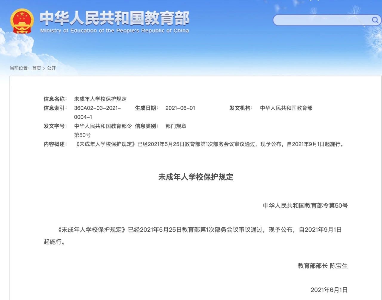 6月1日,教育部举办新闻发布会,时任教育部部长陈宝生签发了第50号教育部令,颁布《未成年人学校保护规定》(以下简称《规定》)。