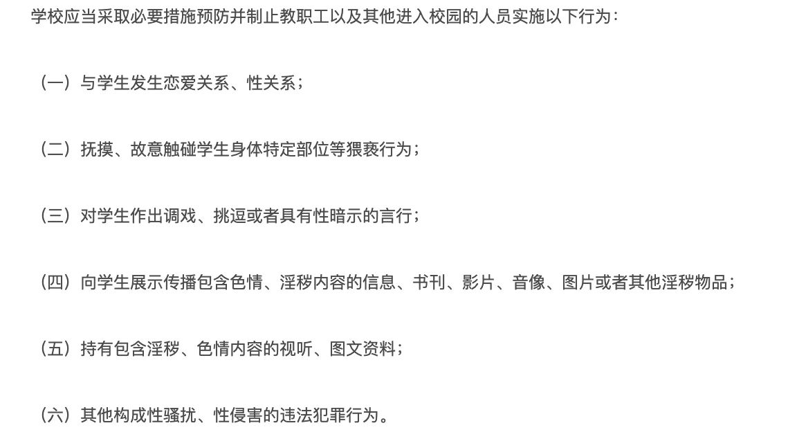 《规定》中第三章第二十四条规定:学校应当建立健全教职工与学生交往行为准则、学生宿舍安全管理规定、视频监控管理规定等制度,建立预防、报告、处置性侵害、性骚扰工作机制。