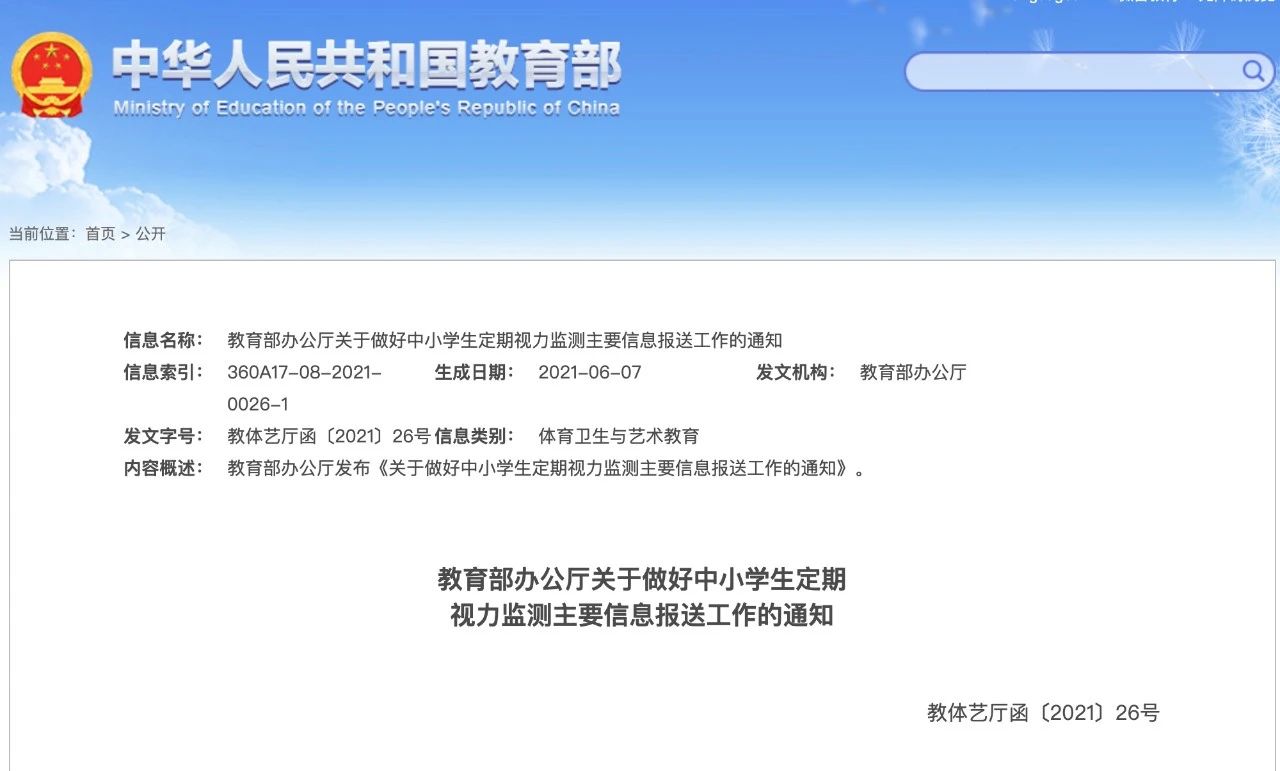 6月3日,教育部印发《关于做好中小学生定期视力监测主要信息报送工作的通知》,切实落实学生健康体检制度和视力监测制度。